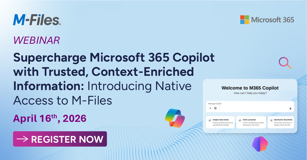 M-Files event Land Land LandAllaFinland (2)Globala händelser (1)Norge (1)Sverige (2)Storbritannien (4)Förenta staterna (1) Datum Datum DatumAlla2026-03-18 (1)2026-03-22 (1)2026-03-25 (1)2026-03-26 (1)2026-04-14 (1)2026-04-16 (1)2026-04-27 (1)2026-04-28 (1)2026-04-29 (1) Microsoft AI Tour Stockholm 2026Manufacturing IT/OT Summit USA 2026Document Management and AI – The leadership SummitMicrosoft AI Tour CopenhagenThe Knowledge Management Conference – KMWorld Europe 2026Supercharge Microsoft 365 Copilot with Trusted, Context-Enriched InformationGartner Digital Workplace Summit 2026 in London, U.K.Microsoft AI Tour Helsinki 2026The M-Files & Microsoft Connected Content Summit 2026 Webinarer on-demand Webinar | Work Faster and Smarter with the New M-Files Desktop Event Date: On-Demand Transforming Financial Services Enterprise with M-Files + Microsoft 365 Event Date: On-Demand Innovation in Motion: M-Files Product Update Event Date: On-Demand AI-Driven Manufacturing with M-Files + Microsoft 365 Event Date: On-Demand A Deep Dive: Unlocking the Power of M-Files and Microsoft 365 partnership Event Date: On-Demand M-Files Cloud + Microsoft: Benefits and Capabilities with your Microsoft 365 Investment Event Date: On-Demand